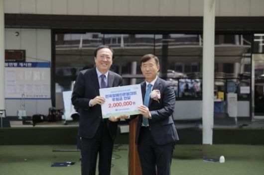 한민규 사학연금 상임감사(오른쪽)가 지난 16일 공승근 전남도장애인론볼연맹 회장에게 전국 장애인 론볼대회 성공적 개최를 위한 후원금을 전달하고 있다. 사학연금 제공 |