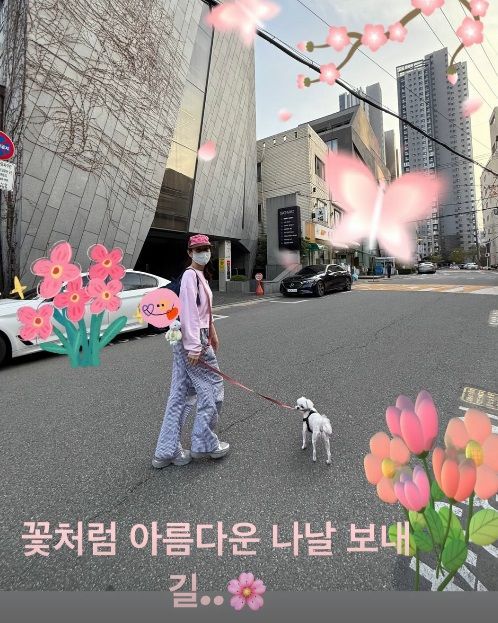 사진 속 손예진은 반려견과 함께 길을 걸었다.