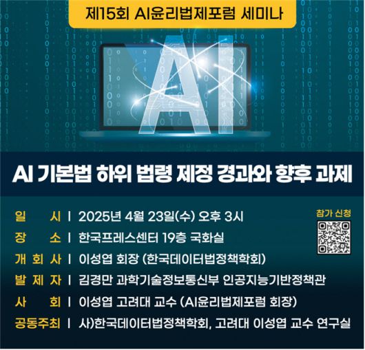 [이데일리 김현아 기자] 한국데이터법정책학회(회장 이성엽 고려대 교수)가 23일(화) 오후 3시 서울 한국프레스센터 19층 국화실에서 ‘AI 기본법 하위법령 제정경과와 향후 과제’를 주제로 제15회 AI 윤리법제포럼을 개최한다.