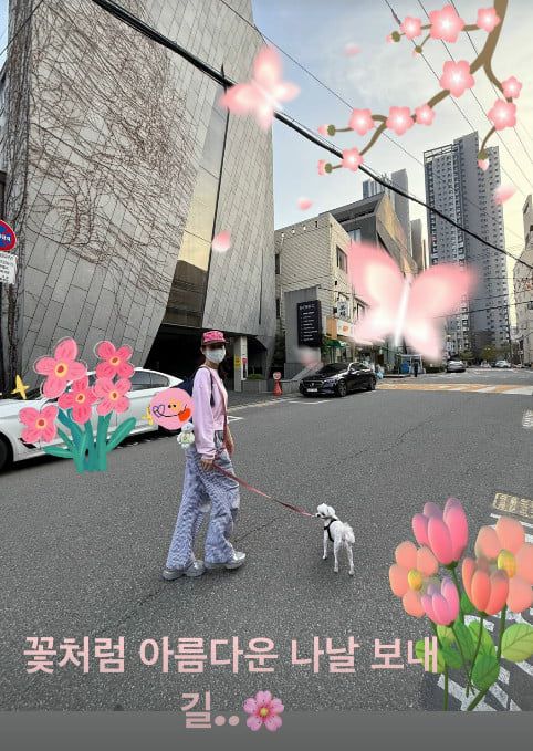 공개된 사진 속에서 손예진은 힙한 느낌의 와이드 팬츠와 모자에 꽃놀이와 잘 어울리는 분홍빛 맨투맨을 착용한 채 강아지와 함께 산책을 나선 모습.