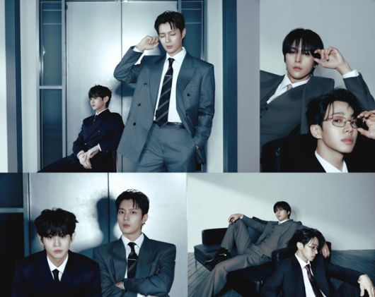 포토 속 하이라이트는 사무실이 떠오르는 공간을 배경으로 범접할 수 없는 분위기를 발산하고 있다. 멤버들은 세련된 정장과 함께 안경, 넥타이, 휴대폰 등 아이템을 활용한 스타일링과 포즈로 각자 비범한 매력을 드러냈다.