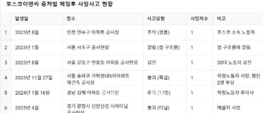 포스코이앤씨 사업장에서는 중대재해처벌법이 시행된 2022년 1월 이후 2023 8월 인천연수구 아파트 공사장 현장 추락사고를 시작으로 이번 광명 신안산선 붕괴 사망사고까지 총 6건의 산재 사망사고가 발생했다.