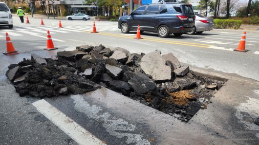 이번 현상은 도로 내 아스콘 포장 표층부의 미세균열이 빗물 유입 및 급격한 기온변화에 따른 수축팽창으로 균열폭이 커진 것이 원인으로 파악됐다.