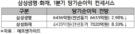 17일 금융정보업체 에프앤가이드에 따르면 올 1분기 삼성생명과 삼성화재의 당기순이익 컨센서스는 각각 6436억원, 삼성화재는 6435억원 등으로 집계됐다. 삼성생명은 지난해 같은기간 6633억원과 비교해 2.98%, 삼성화재는 7020억원 대비 8.33% 각각 감소할 것으로 예측됐다.