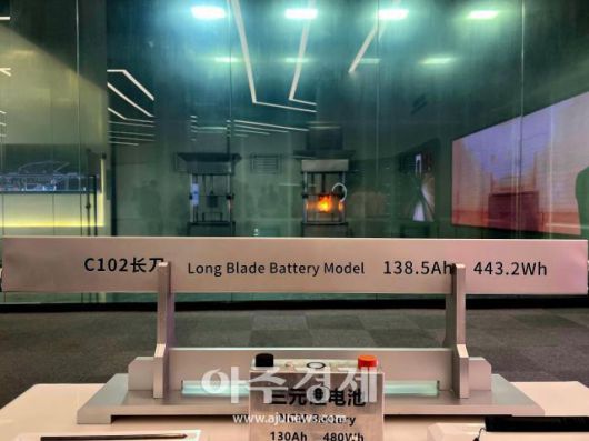 중국 전기차 기업 비야디의 전시관에서 자사 블레이드 배터리와 삼원계 배터리 안전성을 비교하는 '네일 침투 테스트'를 진행하고 있다. [사진=아주경제DB] |