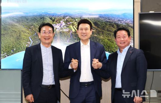 [포항=뉴시스] 송종욱 기자 = 포항시는 코스타밸리 관광휴양 지구 조성을 위해 ㈜코스타밸리모나용평과 관광 복합 단지 개발 협력 방안을 논의하는 등 대규모 민자 유치를 추진한다고 17일 밝혔다. 사진은 이강덕 포항시장이 지난 16일 서울 용평리조트 사무실을 방문해 관광복합단지 협력 방안을 논의한 후 이정협(왼쪽부터) ㈜중원 회장, 이 시장, 임학운 ㈜코스타밸리모나용평 대표이사가 손을 맞잡고 기념 촬영하는 모습. (사진=포항시 제공) 2025.04.17. photo@newsis.com |