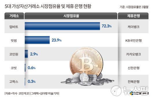 [서울=뉴스핌] 송주원 기자 = 압도적인 비율로 가상자산시장을 점유 중인 업비트와 케이뱅크의 제휴 계약 만료가 반년 앞으로 다가오면서 은행권이 가상자산거래소와 제휴를 맺는데 공들이고 있다. 최근 빗썸과 제휴한 KB국민은행이 석 달도 채 되지 않아 5조원이 넘는 예금을 확보하는 등 가상자산은 은행권 새 먹거리로서 저력을 입증한 터다. 정진완 우리은행장은 가상자산업계의 오랜 안건이었던 '1거래소-다자 은행'제휴까지 정치권에 직접 건의하고 나섰다.