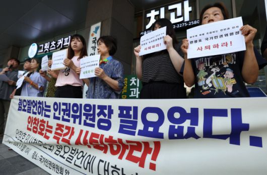 지난해 9월9일 서울 중구 저동 인권위 앞에서 안창호 위원장의 혐오 발언에 대해 항의하며 사퇴를 요구하는 인권단체 회원들. 김영원 기자 forever@hani.co.kr |