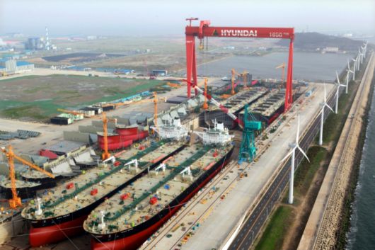 조선 호황기 시절 현대중공업 군산조선소의 도크가 건조중인 선박들로 가득 차 있다. 한때 5000명이 넘는 사람들로 붐볐던 이 조선소는 지난 7년간 70여 척의 배를 만들어냈다. 조선 시황이 좋았던 2012~2015년엔 매년 1조원 규모의 매출을 올렸다. /사진=머니투데이DB |