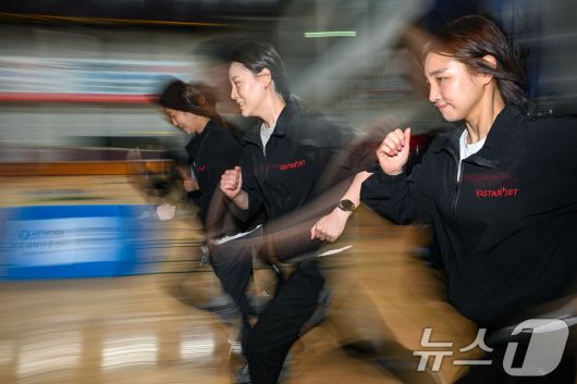 이스타항공 승무원들이 17일 서울 마포구 체력인증센터에서 첫 체력 시험 도입을 앞두고 체력 측정 및 훈련을 실시하고 있다. 이스타항공은 오는 23일부터 기내 안전 요원으로서의 역량 증진을 위해 신입 승무원들의 첫 체력 시험 전형을 치를 예정이다. (공동취재) 2025.4.17/뉴스1 ⓒ News1 이승배 기자 |
