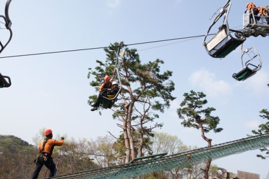 [용인=뉴스핌] 우승오 기자 = 용인소방서는 17일 에버랜드 고공 놀이시설에서 발생할지 모르는 사고에 대비한 '특별 구조훈련'을 했다고 밝혔다.