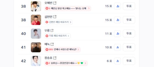 [스타데일리뉴스=정상훈기자] 가수 무룡이 4월 3주차 디시트렌드(dctrend) 일간 투표에서 트로트 남자 부문 40위를 차지했다. '트로트에 빠지게 만든 그 남자! 내 마음까지 훔친 1위 남자는?'이라는 주제로 진행된 이번 투표에서 무룡은 17일 오후 2시 5분 기준 총 11표를 얻으며 변함없는 팬들의 지지를 확인했다.