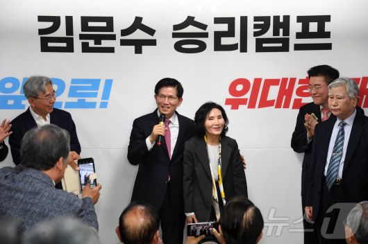(서울=뉴스1) 김민지 기자 = 국민의힘 대선 경선에 출마하는 김문수 후보자가 17일 오후 서울 여의도 선거사무소에서 열린 개소식에서 인사말을 하던 도중 부인을 소개하고 있다. (공동취재) 2025.4.17/뉴스1kimkim@news1.krCopyright ⓒ 뉴스1. All rights reserved. 무단 전재 및 재배포, AI학습 이용 금지.