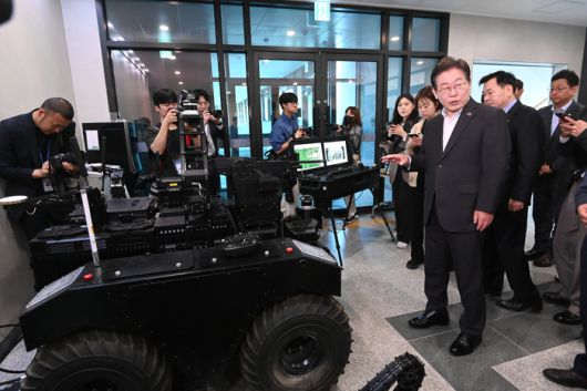 더불어민주당 대선후보 경선 주자인 이재명 전 대표가 17일 대전 유성구 국방과학연구소에서 개발 중인 무기체계를 둘러보고 있다. 연합뉴스 |