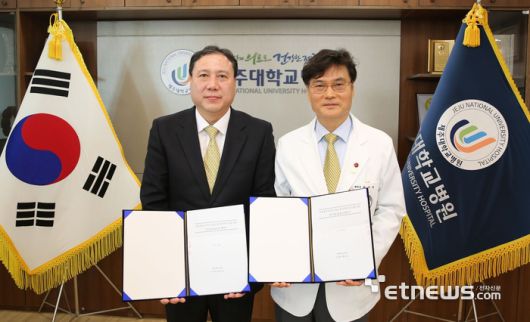 지난 15일 제주대학교병원에서 열린 의료영상 온라인 발급 서비스를 위한 HScan 솔루션 계약 체결식에서 최국명 제주대학교병원장(오른쪽)과 김기풍 헬스허브 대표이사가 기념촬영을 하고 있다. (사진=제주대학교병원 제공) |