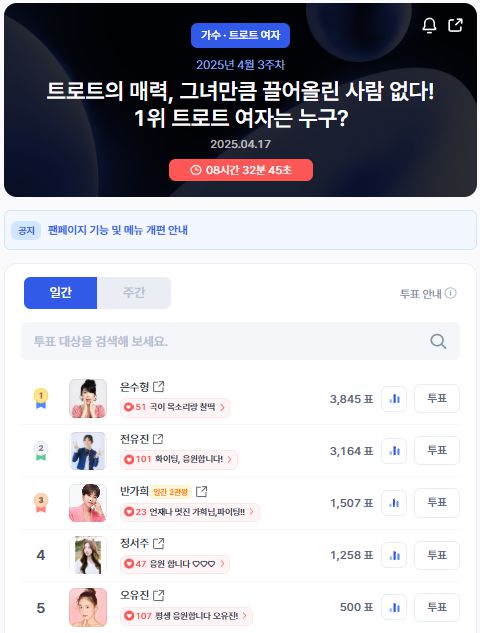 [스타데일리뉴스=정상훈기자] 가수 반가희가 4월 3주차 디시트렌드(dctrend) 일간 투표에서 트로트 여자 부문 3위를 차지했다. '트로트의 매력, 그녀만큼 끌어올린 사람 없다! 1위 트로트 여자는 누구?'라는 주제로 진행된 이번 투표에서 반가희는 17일 오후 3시 27분 기준 무려 1,507표를 획득하며 팬덤의 강한 응원과 인기를 입증했다.