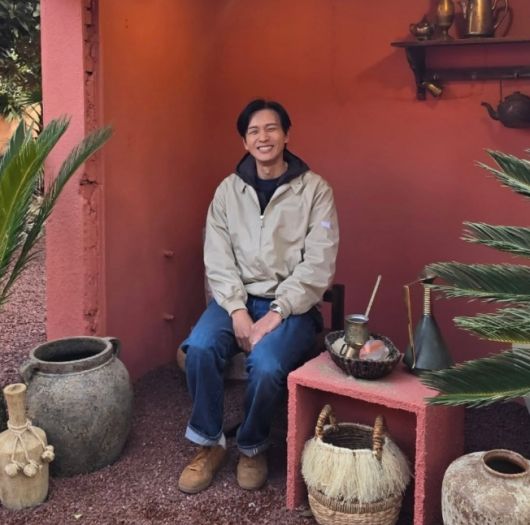 사진 속 구본승은 빨간 배경의 카페 앞 포토존으로 보이는 곳에 앉아 해맑게 눗웃음을 짓고 있다.