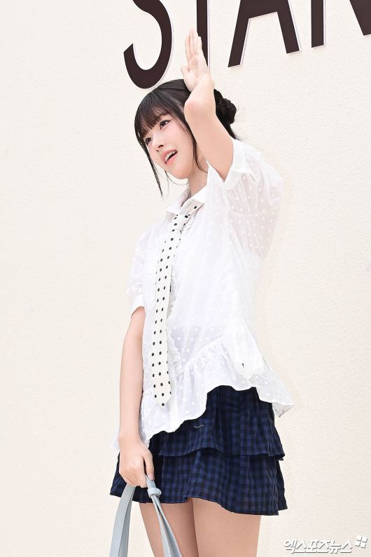 셔츠 밑단의 러플 디테일은 사랑스러운 분위기를 강조했고, 네이비 체크 미니스커트는 단정함과 발랄함을 동시에 살렸다.