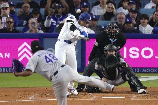 쉬지 않고 몰아친 타선 탓에 오타니는 1회말 두 번째 타석에 들어섰다. 다저스가 6-0으로 앞선 1회말 2사 2루에서 마르케스의 포심 패스트볼을 때려 1타점 적시타로 7-0을 만들었다.