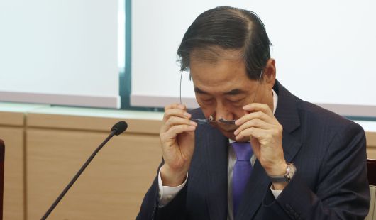 한덕수 대통령 권한대행 겸 국무총리가 17일 정부서울청사에서 열린 제6차 APEC 정상회 준비위원회에 참석해 안경을 고쳐쓰고 있다. 대통령실사진기자단 |
