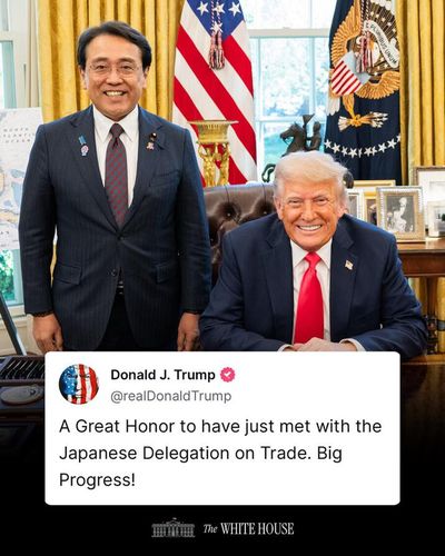 이후 그는 소셜미디어 트루스 소셜에 아카자와 경제재생상과 함께 찍은 사진을 올리며 "일본 무역 대표단과 만나 큰 영광이다. 큰 진전!"이라고 적었다.
