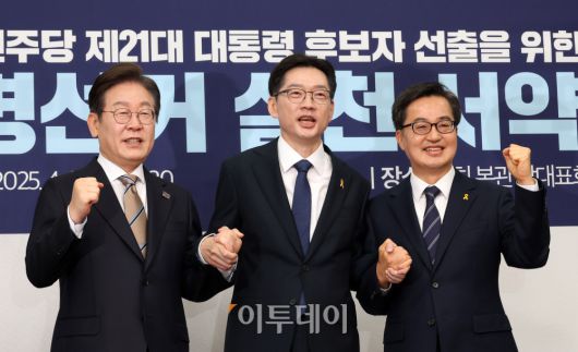 16일 서울 여의도 국회에서 열린 더불어민주당 공명선거 실천 서약식에서 이재명(왼쪽부터), 김경수, 김동연 대통령 선거 경선 후보자들이 손을 잡고 있다. 사진=고이란 기자 photoeran@ |