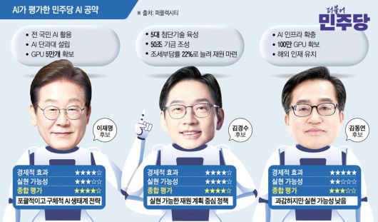 17일 본지가 생성형 AI ‘퍼플렉시티’를 통해 민주당 경선에 나선 이재명, 김동연, 김경수 후보가 낸 AI 공약을 정리해 심층 분석 및 평가를 맡긴 결과다. 평가 기준은 경제적 효과, 실현 가능성, 민주당 이념 부합성 3가지로 설정했고, AI에 종합 평가 및 별점을 매길 것을 주문했다.