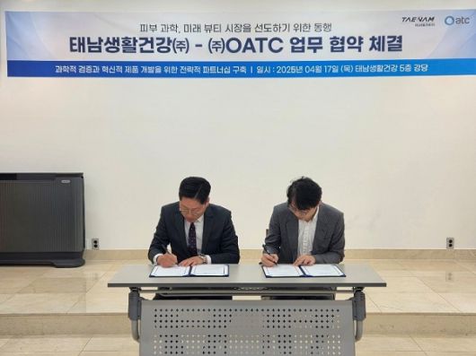 태남생활건강㈜과 임상시험 전문기업 ㈜오에이티씨(OATC)는 '피부 과학, 미래 뷰티 시장을 선도하기 위한 동행'이라는 주제로 17일(목) 업무협약(MOU)을 체결했다. 이번 협약은 과학적 검증과 혁신적 제품 개발을 위한 전략적 파트너십 구축을 목표로 한다. 양사는 고기능성 화장품의 연구 개발, 피부과학 기반 효능 검증, 지속 가능한 원료 활용 등 미래 뷰티 트렌드를 선점하기 위해 협력 체계를 마련했다.