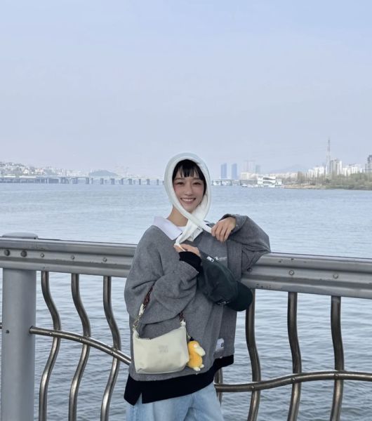 또한 전반적으로 캐주얼한 패션에 귀여운 디테일을 더했다. 차분하고 자연스러운 코디에 비해, 어깨에 걸린 미니 백은 깔끔한 화이트 톤에 노란색의 귀여운 캐릭터 키링과 밝은 초록색의 반스 스니커즈를 이용해 전체적인 톤을 해치지 않으면서 발랄하고 귀여운 느낌을 포인트로 연출했다.