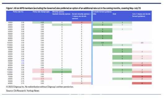 이날 한은은 기준금리를 연 2.75%로 동결했다. 하지만 신성환 금융통화위원은 25bp 금리 인하 소수의견을 제시했다. 또 총재를 제외한 6명의 금통위원 모두 포워드 가이던스에서 향후 3개월 내 추가 인하를 주장했다.