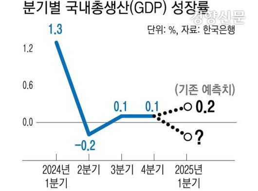 한국은행이 공식 발표 이전에 1분기 역성장 가능성을 이례적으로 내비친 건 그만큼 경제 상황이 좋지 않다고 판단했기 때문으로 풀이된다. 이창용 한은 총재는 “갑자기 어두운 터널로 들어온 느낌”이라고 했다. 정치적 불확실성과 관세전쟁이 빚은 ‘시계 제로’ 상황에서 당장 기댈 ‘언덕’은 추가경정예산(추경) 편성과 다음달 금리인하뿐이다.