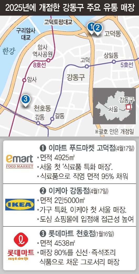 업계 관계자는 “강동과 마곡은 서울이지만 신축 아파트가 많고 3040 인구가 빠르게 늘어난 ‘신도시’ 분위기가 있는 곳이다. 오프라인 유통업체들이 사활을 걸 수밖에 없는 상황”이라고 짚었다.