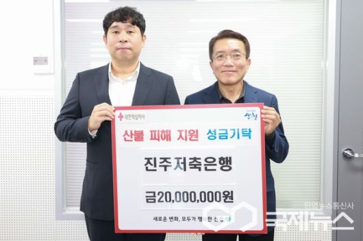 (진주=국제뉴스) 구정욱 기자 = 진주저축은행이 산청과 하동에서 발생한 대형 산불로 인해 큰 피해를 입은 지역주민들을 지원하고, 이들의 빠른 일상 복귀를 돕기 위해 17일 양 지자체에 총 4천만 원의 기부금을 전달했다.