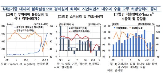 이날 한은은 국내 정치 불확실성 장기화, 예상보다 강화된 미국 관세 정책의 영향으로 3월 중 경제심리가 다시 위축됐다고 봤다. 여기에 영남지역 대형 산불 등 일시적 요인까지 겹치면서 1분기 성장률은 지난 2월 전망치인 0.2%를 밑돌 것으로 추정했다.