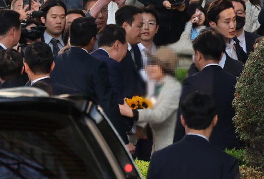 윤 전 대통령은 지난 11일 서초동 주상복합 아파트 아크로비스타에 도착해 한 여성으로부터 꽃다발을 받았다.