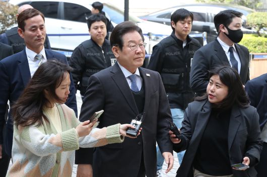 더불어민주당 이재명 대표가 지난 8일 오전 서울 서초구 서울중앙지법에서 열린 '대장동 배임·성남FC 뇌물' 1심 속행 공판에 방탄복을 입고 경호를 받으며 출석하고 있다./박성원 기자 |