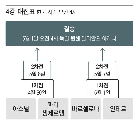 ‘꿈의 무대’라 불리는 UEFA(유럽축구연맹) 챔피언스리그(UCL) 4강 대진이 완성됐다. 16~17일(한국 시각) 펼쳐진 대회 8강 2차전 결과 아스널(잉글랜드)과 파리 생제르맹(PSG·프랑스), 바르셀로나(스페인)와 인테르(이탈리아)가 각각 결승 진출을 놓고 맞붙게 됐다. 유럽 5대 리그 중 독일을 뺀 네 리그 팀이 골고루 4강에 올랐다. 잉글랜드 프리미어 리그(EPL) 2위인 아스널(1위는 리버풀)을 제외하면 PSG처럼 프랑스 리그1 우승을 이미 확정하거나 현재 리그 선두(스페인 라 리가 1위 바르셀로나, 이탈리아 세리에A 1위 인테르)를 달리는 팀들이라 유럽 최강을 향한 한 치 양보 없는 자존심 대결이 펼쳐지게 됐다.