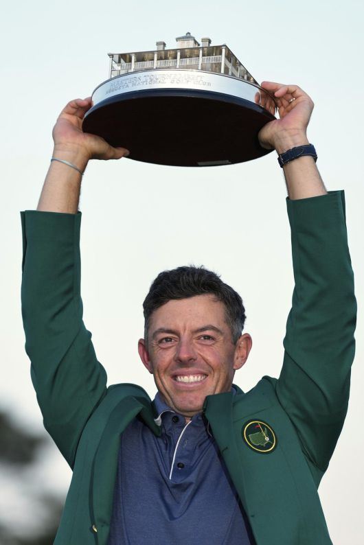 로리 매킬로이가 14일 끝난 미국프로골프(PGA)투어 메이저대회 마스터스에서 우승한 뒤 트로피를 들고 환호하고 있다. 오거스타=AP 뉴시스 |