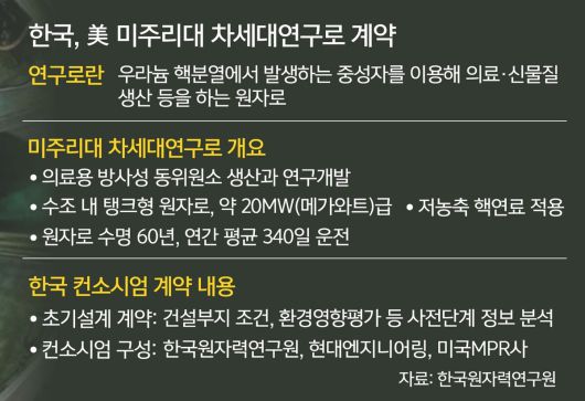17일 과학기술정보통신부에 따르면 한국원자력연구원과 현대엔지니어링, 미국 MPR사 컨소시엄은 미국 미주리대가 국제 경쟁입찰한 ‘차세대 연구로’ 설계 사업에 지난해 7월 최종협상 대상자로 선정됐으며 이날 첫 단계인 초기설계 계약을 맺었다. 초기설계 다음 단계는 개념설계·기본설계와 건설 인허가, 서류 작성 등이다. 초기설계 규모는 1000만달러(약 142억원) 수준이며 단계가 올라갈수록 금액이 커진다. 미국 언론 등에 따르면 건설을 포함한 전체 사업 규모는 8~10년간 약 10억달러(1조4204억원)로 추정된다.