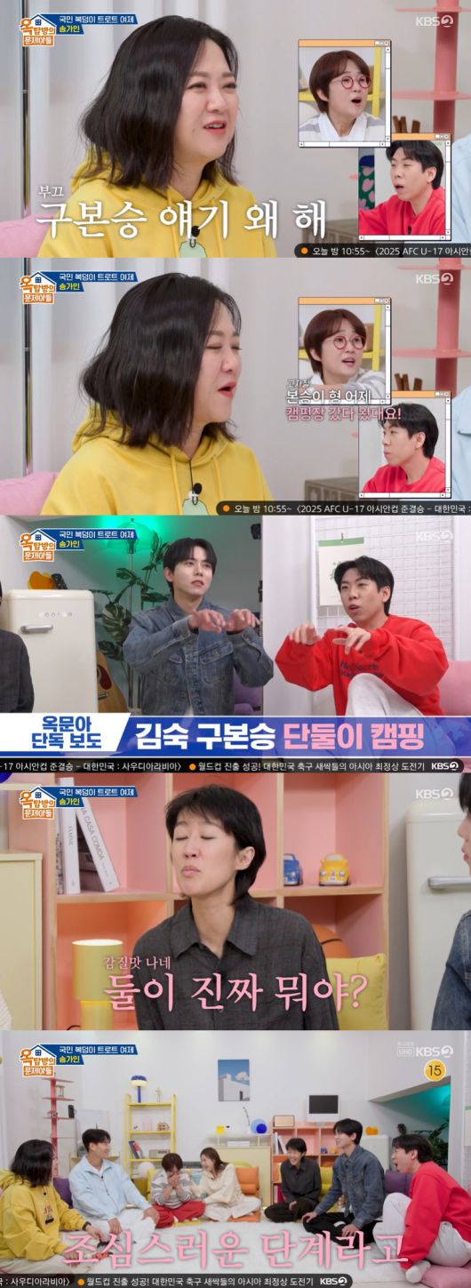양세찬은 "본승이 형?"이라며 김숙과 러브라인을 이어가고 있는 구본승을 언급했고, 김숙은 "본승이 형 어제 캠핑장 갔다 왔다"며 두 사람의 캠핑장 데이트를 폭로했다.