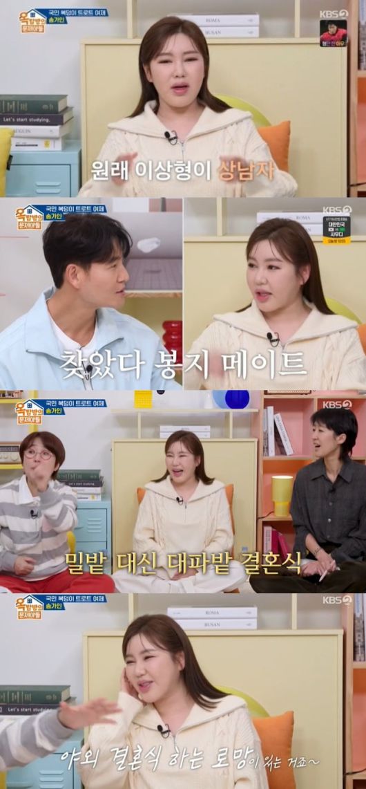 결혼식은 대파밭에서 하고 싶다고. 송가인은 “원빈, 이나영 부부의 결혼식이 너무 예쁘고 멋있더라. 나도 시골에서 자라서 그런 자연이 좋다. 아빠가 대파밭이 있으니까, 시간에 구애받지 않고 자유로운 야외 결혼식 로망이 있다”고 밝혔다.