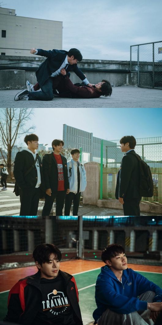 소중한 것들을 지키기 위해, 그리고 끝내기 위해 연시은과 함께 싸우는 박후민(려운), 서준태(최민영), 고현탁(이민재)의 뜨거운 우정 서사도 기대되는 대목이다. 연시은에게 손을 내밀고, 각자의 방식으로 일진 연합에 맞서는 은장고 3인방의 비범한 존재감은 이들의 활약에 대한 호기심을 더욱 자극한다. 한편, 서준태를 압박하는 껄렁한 모습과 달리 한껏 겁에 질린 최효만(유수빈)의 얼굴은 ‘강약약강’ 그 자체를 보여주고, 거대 연합의 정점 나백진(배나라)의 서늘한 카리스마는 소름을 유발한다. 은장고의 대장 박후민과 연합 최강자 나백진의 일촉즉발 신경전은 ‘숨멎’ 긴장감을 자아낸다. 아슬아슬한 눈맞춤에 이어진 물러섬 없는 정면 승부는 두 사람의 심상치 않은 재회를 예고한다.