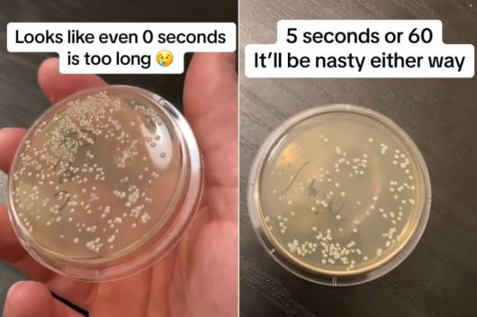 '5초 법칙'을 확인하는 실험에서 떨어진 직후의 박테리아 상태(왼쪽)과 떨어진 지 1분이 지난 후의 박테리아 상태./틱톡 |