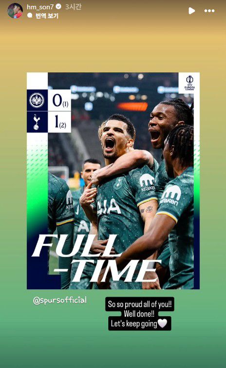 손흥민은 자신의 SNS에 경기 결과가 적힌 사진과 함께 "너희들이 자랑스럽다. 정말 잘했다. 앞으로 더 나아가 보자"라는 글을 게시했다.