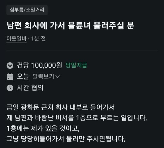 작성자는 “금일 광화문 근처 회사 내부로 들어가서 제 남편과 바람난 비서를 1층으로 부르는 일”이라며 “1층에는 제가 있을 것이고, 그냥 당당히 들어가서 불러만 주시면 된다”고 설명했다.