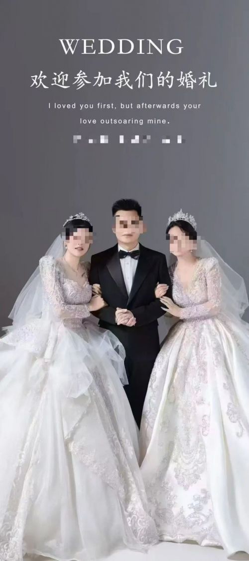17일 펑파이신문에 따르면 구이저우성 비제시의 한 예식장에서 ‘세 사람이 함께 결혼식을 올린다’는 소식이 퍼지며 논란이 커졌다. 공개된 사진에는 턱시도 입은 남성이 웨딩드레스를 입은 두 여성과 나란히 팔짱을 끼고 있다. “우리의 결혼식에 초대합니다”라는 문구와 함께 신랑과 두 명의 ‘신부’ 이름이 적혀 있다.