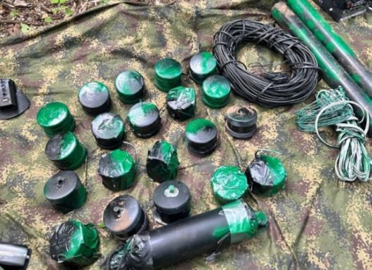 콜롬비아 군이 밀림에서 발견한 게릴라단체의 대인지뢰와 폭발물 테러 장비. 콜롬비아 국방부 제공 |