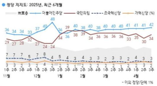 정당 지지도는 민주당 42%, 국민의힘 34%, 조국혁신당 3%, 개혁신당 2%였다. 지지 정당이 없는 무당(無黨)층은 18%로 집계됐다.
