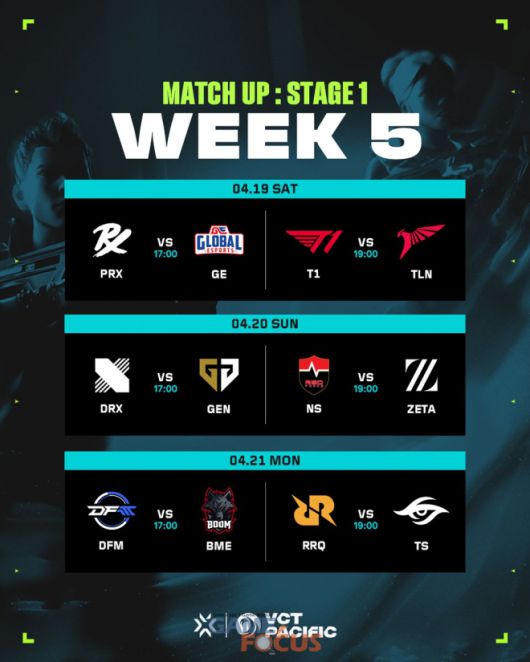 5대5 대전형 캐릭터 기반 전술 슈팅 게임 '발로란트'의 개발 및 유통사인 라이엇 게임즈(한국 대표 조혁진)는 오는 19일(토)부터 21일(월)까지 서울 마포구 상암동에 위치한 상암 SOOP 콜로세움에서 열리는 VCT 퍼시픽 스테이지 1 5주 차 결과에 따라 농심 레드포스의 플레이오프 진출 여부가 결정된다고 밝혔다.