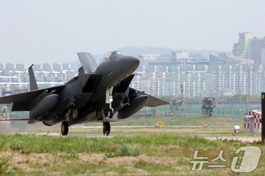 (광주=뉴스1) 이승현 기자 = 18일 오전 광주 광산구 신촌동 광주공군기지에 한국 공군의 F-15K 전투기가 착륙하고 있다. 한미공군은 5월 2일까지 공군 광주기지에서 2주에 걸쳐 대규모 연합공중훈련 '프리덤 플래그(Freedom Flag)'를 실시한다. 2025.4.18/뉴스1
